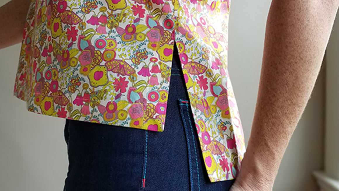 The Farrah pattern is a ruffle detailed tunic blouse and knee-length dress. View A includes ruffle short sleeves and View B is sleeveless with a front ruffle. Both views include a side slit with a high-low hem detail.