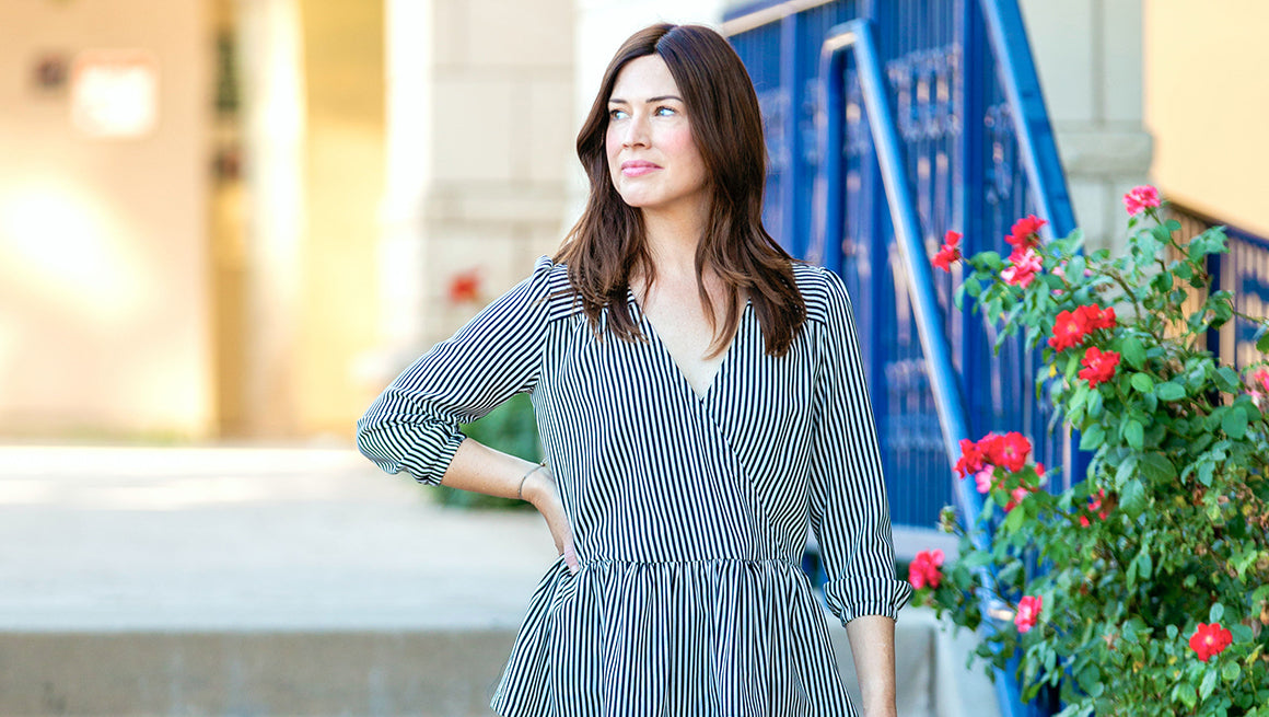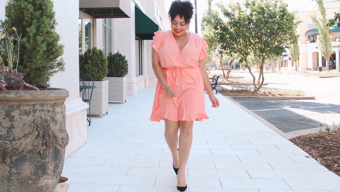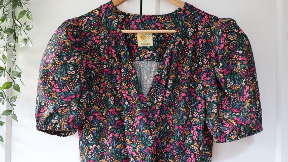 The Orchid Midi Dress is a wrap bodice with a midi length skirt. View A has ruffle sleeves. View B has long sleeves with a gathered cap and wrist. There is a combination of elastic and drawstring to define the waist and add drape to the bodice.