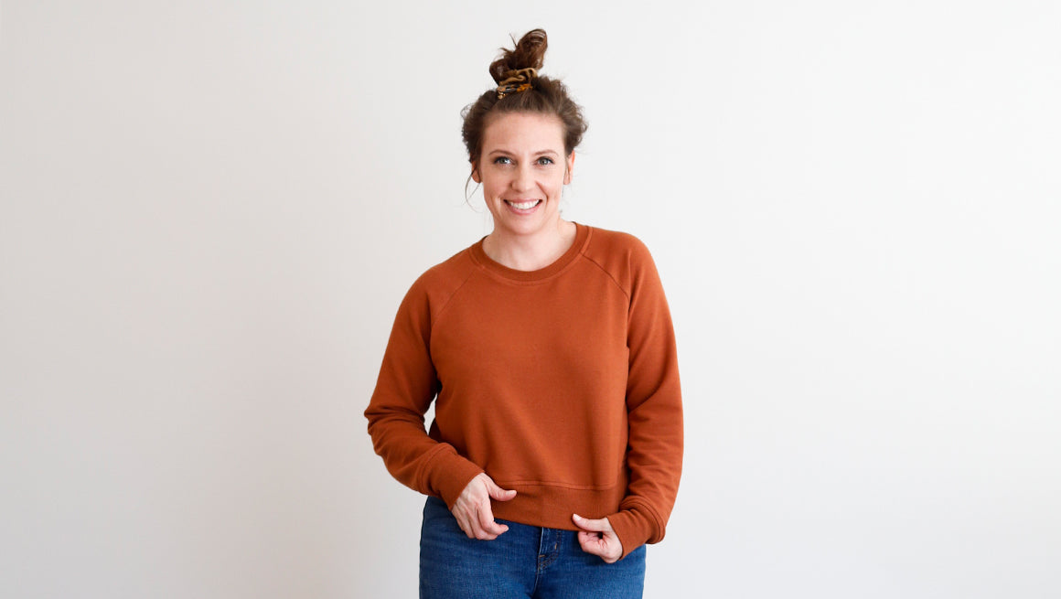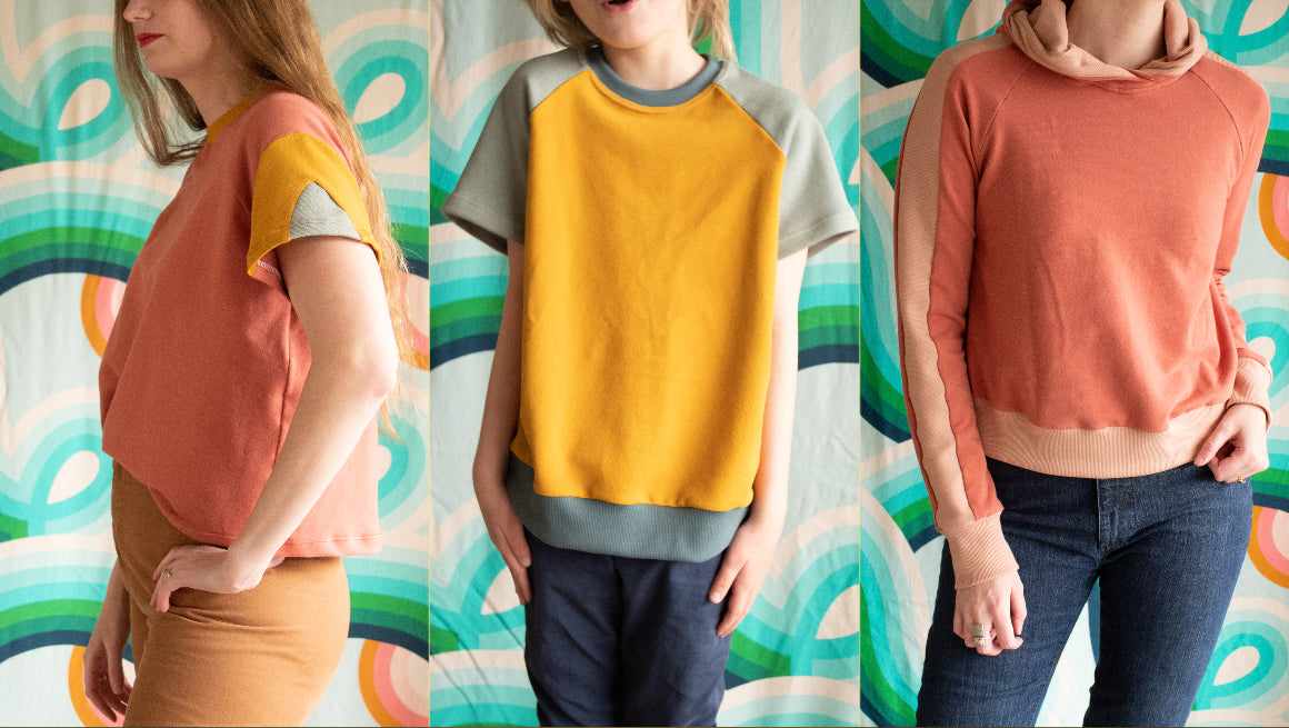 The Page is a cropped hooded sweatshirt. There are two hem finishes. View A has a banded hem and View B has a drawstring hem. There are three sleeve styles that are interchangeable for both views.